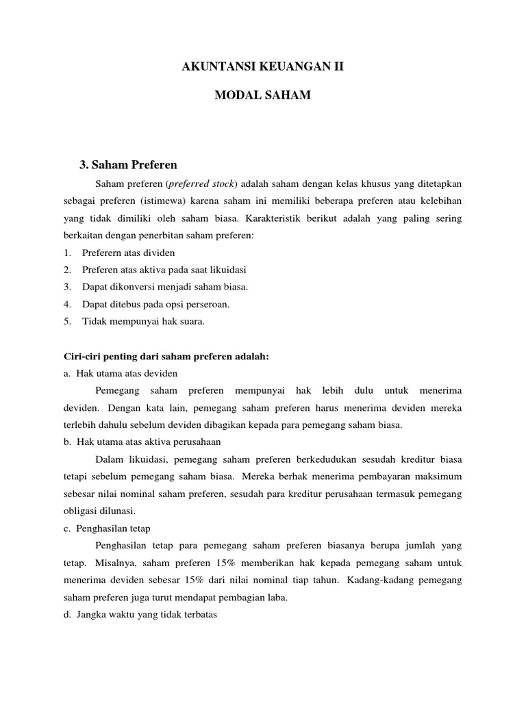 6900000 yaitu saham preferen untuk saham biasa yang dimiliki SOAL saat itu harga saham biasa dipasaran Rp. 36400 x 450 lembar Rp 16380000 Nilai saham preferen. Contoh soal dan jawaban tentang pencatatan penerbitan saham akan berkaitan dengan proses pembelian saham dari lembaga penjamin atau underwriter sampai ke para investor. Itulah tadi penjelasan serta beberapa perbedaan saham biasa dan saham preferen yang perlu kamu ketahui. Dengan mengetahui perbedaan dari kedua jenis saham ini, tentu akan lebih mudah untuk menentukan jenis saham yang ingin kamu pilih. Penulis: Kontributor. Editor: Anju Mahendra. Saham Preferen (Preferred Stock) Saham yang memiliki karakteristik gabungan antara obligasi dan saham biasa, karena bisa menghasilkan pendapatan tetap. Saham ini lebih aman dibandingkan dengan saham biasa karena memiliki hak klaim terhadap kekayaan perusahaan dan pembagian dividen terlebih dahulu. Berikut contoh soal perhitungan saham prioritas dan saham biasa. Perbedaan saham preferen dan saham biasa terletak pada kemampuan mempengaruhi pengambilan keputusan diperusahaan. Menerbitkan 20000 lembar saham. 752020 Contoh soal dan jawaban saham preferen dan saham biasa menjadi salah satu jenis saham yang dimiliki perusahaan.