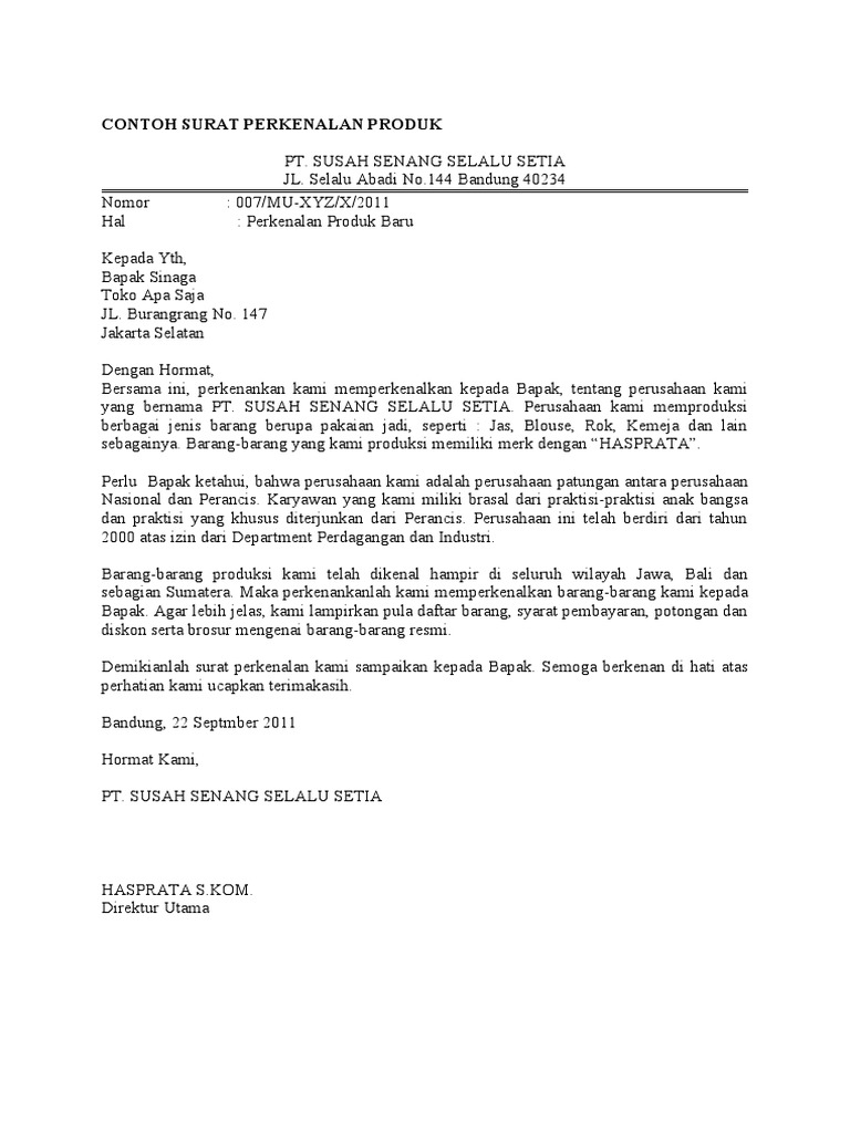 jenis-jenis surat bisnis. Diposting oleh Unknown di 02.14. 1) Surat Perkenalan. Adalah surat dari penjual kepada calon pembeli yang berisi informasi tentang perusahaan penjual agar diketahui oleh calon pembeli sehingga perkenalan itu akan berkelanjutan dengan proses berikutnya menurut transaksi. Informasi tentang perursahaan penjual yang ...