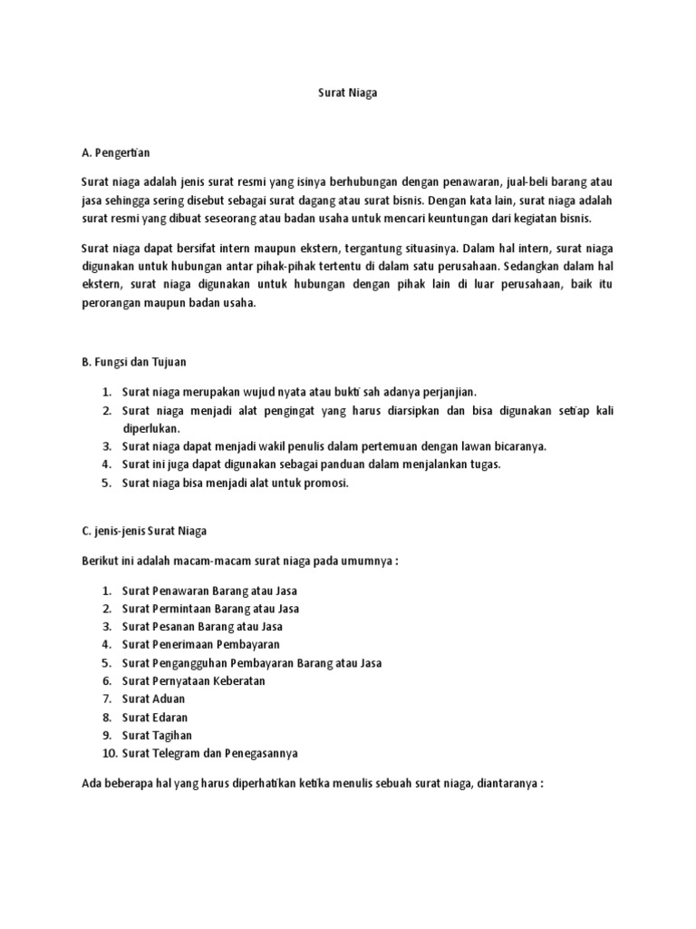 Pengertian Surat Niaga. Apa yang dimaksud dengan surat niaga? Menurut para ahli, Pengertian Surat Niaga adalah suatu surat yang dibuat/ dikeluarkan oleh seseorang atau badan usaha/ perusahaan untuk keperluan niaga atau bisnis. Surat niaga adalah jenis surat resmi yang isinya berhubungan dengan penawaran, jual-beli barang atau jasa sehingga sering disebut sebagai surat dagang atau surat bisnis. Jenis-Jenis Surat Dinas, Ciri, Fungsi Dan Contohnya. Surat Dinas adalah surat resmi yang berkaitan dengan berbagai masalah yang berkaitan dengan layanan resmi, termasuk dalam penunjukan karyawan, transfer karyawan, promosi, kenaikan gaji, dan keputusan untuk memecat karyawan. Adapun beberapa hal yang harus Anda pertimbangkan ketika menulis ... Fungsi surat bisnis ini sama dengan surat jenis lainnya, yaitu sebagai penyampaian pesan, dokumentasi, dan bukti otentik yang dapat dipertanggungjawabkan secara hukum. Tujuan dari surat bisnis ini adalah untuk keperluan pengiriman atau pemesanan barang, undangan rapat, dan permintaan barang atau laporan pertanggungjawaban perusahaan, dll. Amarzan Loebis, TEMPO Publishing · 2013 · Civic leaders... saya melakukan bisnis dengan otodidak, sembari kesandung disana-sini. Dan, saya yakin resep3Cini berfungsi untuk segalamacam jenis kegiatan dan profesi.