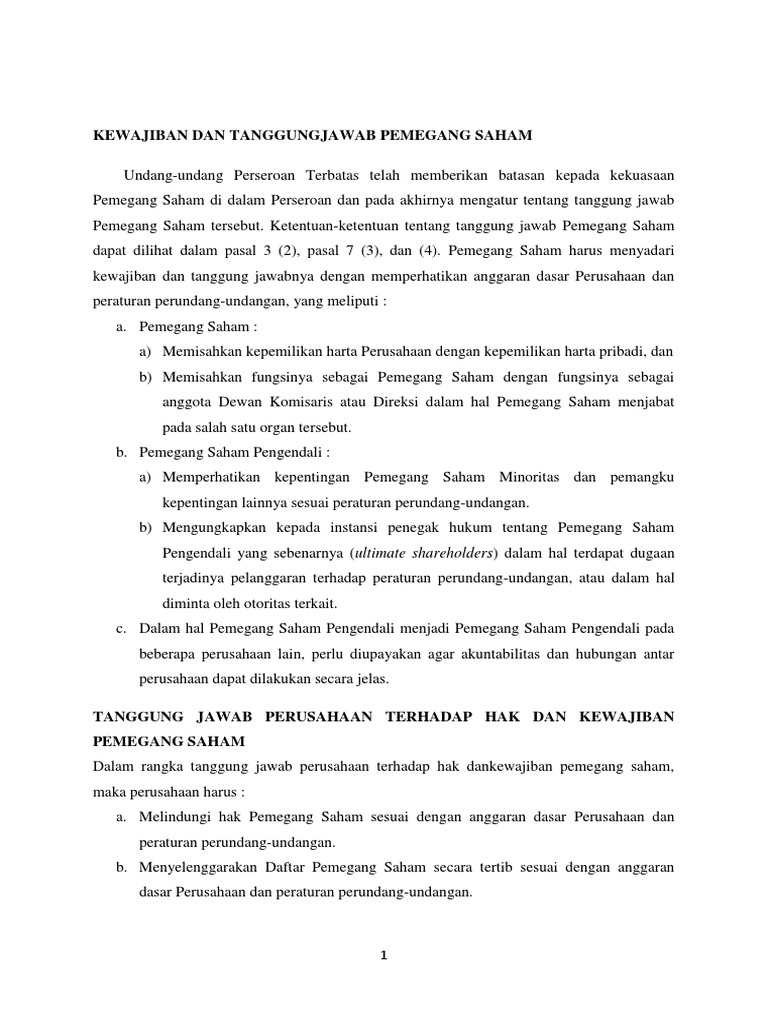 Hak dan kewajiban pemegang saham. Aug 23, 2021 — Pemegang Saham memiliki kebebasan untuk melaksanakan hak dan kewajibannya. b. Pemegang Saham berhak atas pernyataan dan pengungkapan dari.191 pages by A SOEDJITO · 2008 — Untuk itu, semua organ perseroan yang terdiri dari Rapat Umum Pemegang Saham, Komisaris dan Direksi dalam menjalankan roda perseroan, mengindahkan peraturan ... Apr 21, 2020 — kewajiban rapat umum pemegang saham; ... pemegang saham untuk hadir dan memberikan hak suara ... d. hak dan kewajiban Pengguna e-RUPS;. by DKOJ KEUANGAN · Cited by 7 — rangka melaksanakan hak dan kewajiban selaku RUPS. (2) Pemegang saham atau yang setara pada Perusahaan. Perasuransian yang menjabat sebagai anggota Direksi,.53 pages