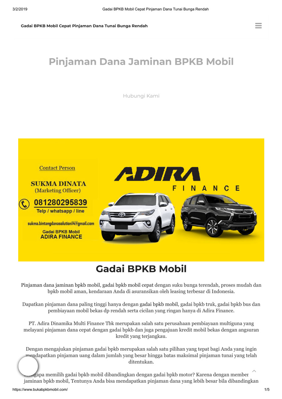 Pinjaman dana tunai jaminan bpkb mobil bunga rendah, gadai bpkb mobil harga tinggi, proses pencairan cepat hanya beberapa jam saja serta bpkb mobil aman hanya di Adira Finance. PT. Adira Dinamika Multi Finance Tbk (Adira Finance) telah dipercaya sebagai perusahaan leasing terbesar saat ini untuk berbagai merk otomotif / mobil bekas di Indonesia, termasuk juga sebagai tempat gadai bpkb mobil ...