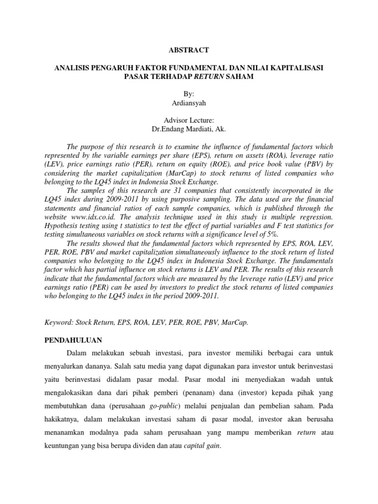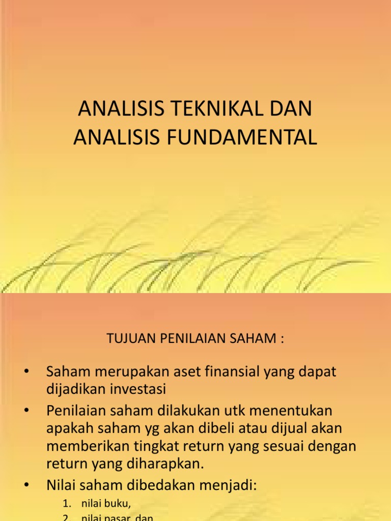 Analisis teknikal dan fundamental saham pdf. Masing-masing analisa memiliki keuntungan dan resiko masing-masing. Investor memiliki metodenya tersendiri dalam menentukan saham yang dibeli. Analisa teknikal merupakan metode yang baik untuk menganalisa kondisi pasar yang sedang terjadi dan berinvestasi dalam kurun waktu yang pendek. Sementara itu, pemilih analisa fundamental rata-rata ... Ebook analisis fundamental saham premium ini membahas semua analisis-analisis fundamental mulai cara memilih saham2 growth, saham2 yang tahan banting terhadap koreksi market, value investing, analisis laporan keuangan untuk investasi saham dan lain2, menggunakan analisa2 yang simpel dan mudah diterapkan untuk semua level investor. Dalam melakukan investasi saham, kamu memerlukan beberapa analisis agar kamu bisa menjadi investor sukses di kemudian hari.Analisis yang lazim digunakan oleh para investor adalah analisis fundamental dan teknikal. Secara umum, analisis fundamental digunakan untuk mengetahui tentang dasar-dasar ekonomi, neraca, laporan laba rugi, dan sebagainya. Di sisi lain, analisis teknikal berkaitan dengan ... Jakarta, CNBC Indonesia - Membeli suatu saham diibaratkan seperti membeli sebuah bisnis, seorang investor perlu melakukan studi kelayakan (feasibility study) atau analisis agar risiko ketidakpastian berkurang dan terhindar dari kerugian. Ada dua analisis yang digunakan investor dalam berinvestasi saham, yakni analisis fundamental dan teknikal. Kedua analisis tersebut sama baiknya dan dapat ...