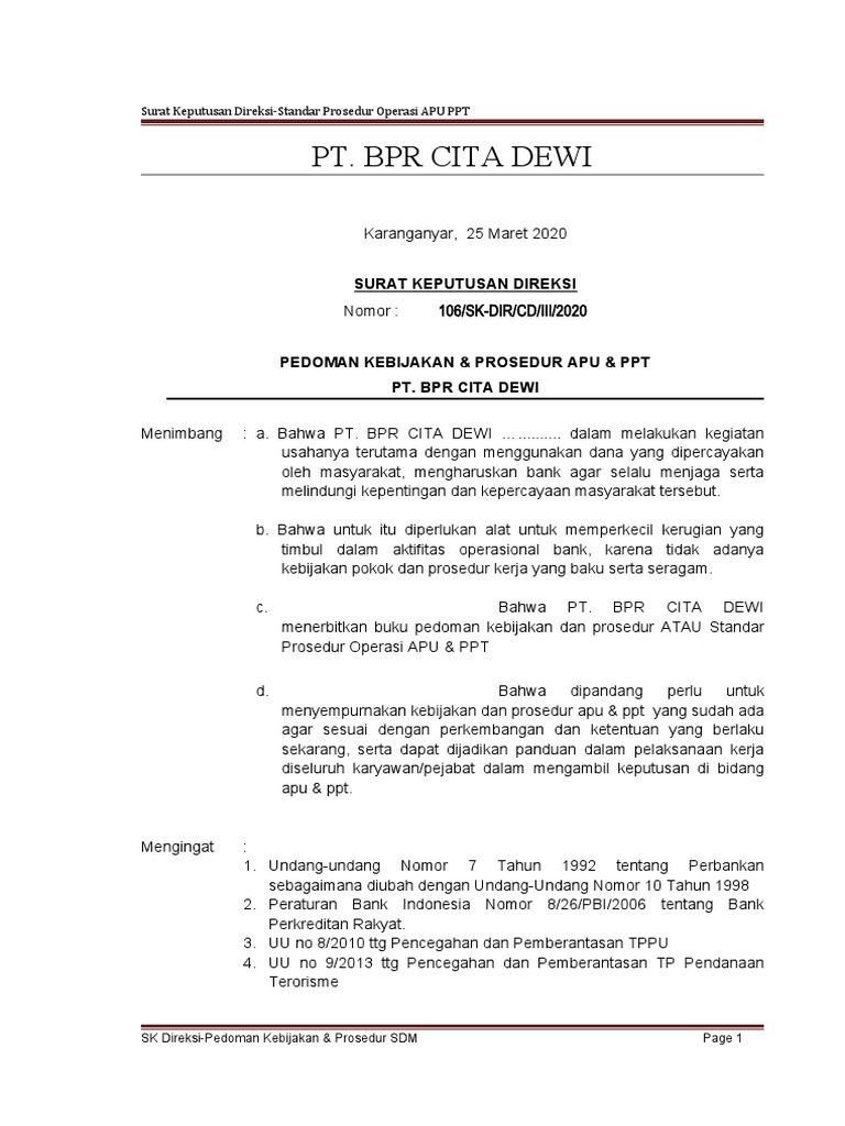 BI: Bunga kredit BPR masih mencekik Tingkat bunga kredit yang ditawarkan Bank Perkreditan Rakyat (BPR) untuk sektor Usaha Mikro, Kecil, dan Menengah (UMKM), sejauh ini dinilai masih Masih tingginya biaya operasional alias overhead cost BPR menjadi penyebab utama mengapa bunga kredit bank kelas teri ini masih begitu tinggi. Perbarindo Sumut Bantu BPR di Sumbagut Susun SOP Kredit ...maka setiap BPR harus menyusun SOP kredit yang dilaporkan kepada Otoritas Jasa Keuangan (OJK) "Kriteria kredit dalam perhatian khusus dimunculkan di antara kredit lancar dengan kurang lancar bidang mikrofinance memaparkan berbagai contoh kasus yang mendera sejumlah BPR dan... 15+ Contoh SOP Perusahaan dll | Beserta Pengertian... - Salamadian Contoh SOP Perusahaan - SOP atau standar operasional prosedur adalah dokumen petunjuk pelaksanaan suatu kegiatan atau pekerjaan agar mencapai hasil yang optimal. SOP dibuat untuk menertibkan dan menstandarisasi suatu kegiatan atau proses pekerjaan.
