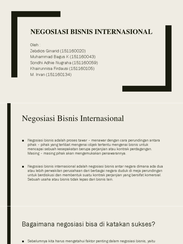 NEGOISASI YANG SUKSES DALAM KASUS BISNIS Bisnis ... Pada dunia bisnis internasional seringkali para usahawan berinteraksi dengan berbagai relasi dari berbagai negara dengan budaya yang berbeda. Dalam menjalankan negosiasi perlu dipahami dan dipelajari komunikasi yang efektif antar budaya sehingga mampu meminimalisasikan konflik yang akan terjadi.