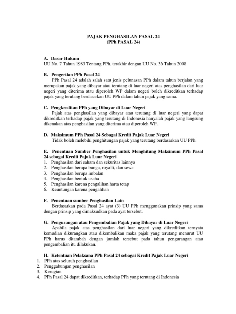 PPh Pasal 24 (Kredit Pajak Luar Negeri) - Kabar Pajak PPh Pasal 24 (Kredit Pajak Luar Negeri) PPh Pasal 24 merupakan pajak luar negeri yang dibayar di luar negeri yang dapat dikreditkan di Indonesia. Pajak yang terutang bagi Wajib Pajak Dalam negeri terutang yang meliputi seluruh penghasilan, termasuk penghasilan yang diterima atau diperoleh dari luar negeri (world wide income). Kredit Pajak sebagai Pengurang PPh Badan Terutang Ketentuan tersebut diatur dalam PPh Pasal 24 yang mengatur tentang hak wajib pajak untuk memanfaatkan kredit pajak mereka di luar negeri. Dalam PPh Pasal 24 diatur mengenai nominal pajak yang dibayarkan di luar negeri yang berfungsi sebagai pengurang nilai pajak terutang yang dimiliki di Indonesia. Baca Juga: Begini Cara Mengajukan Permohonan ... Pahami Kredit Pajak Luar Negeri Dan Contoh Perhitungannya Untuk menghindari pajak berganda, telah diatur dalam Undang-undang Pajak Pendapatan Pasal 24 atau pph pasal 24 mengenai aturan tentang wajib pajak dengan memanfaatkan kredit pajak di luar negeri. Di mana, dalam pasal tersebut menjelaskan bahwa besarnya pajak atas pendapatan wajib pajak dalam negeri yang terutang.