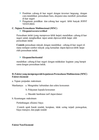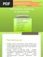 FINAL PPT Investasi Langsung Luar Negeri 2 MANAJEMEN BISNIS GLOBAL "INVESTASI LANGSUNG LUAR NEGERI". KELOMPOK 2. 1. Aklima dhiska suwanda 2. Amja setia 3. Anggi haulani adha 4. Dinda dwi putri 5. Ikrom mulloh 6. Krisma yulianti 7. Masrul lubis 8. Murteza ilham Pendahuluan Foreign Direct Investment (FDI) terjadi saat sebuah perusahaan menanamkan modalnya untuk fasilitas produksi dan atau memasarkan produk di negara asing. Foreign ...