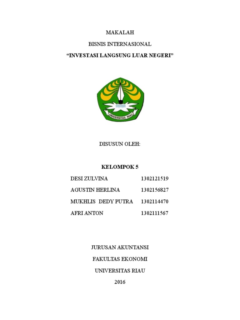 Makalah investasi langsung luar negeri. FDI (Foreign Direct Investment) atau Investasi Langsung ... PENDAHULUAN PENGERTIAN FDI FDI (Foreign Direct Investment) atau investasi langsung luar negeri adalah salah satu ciri penting dari sistem ekonomi yang kian mengglobal.Ia bermula saat sebuah perusahaan dari satu negara menanamkan modalnya dalam jangka panjang ke sebuah perusahaan di negara lain. Dengan cara ini perusahaan yang ada di negara asal (biasa disebut 'home country') bisa… Mengenal Jenis Investasi Beserta Contoh ... - Qoala Indonesia Apa saja jenis-jenis investasi? Jenis-jenis investasi pun beragam mulai dari saham, reksadana, emas peer to peer lending, tabungan berjangka, Robo Advisor, unit link, forex, dan properti seperti rumah maupun apartemen. Terdapat pula jenis investasi yang populer di luar negeri yang ada di indonesia seperti cryptocurrency. 310311873-makalah-investasi-asing-langsung.docx - MAKALAH ... View 310311873-makalah-investasi-asing-langsung.docx from BISNIS PEN 111 at Sebelas Maret University. MAKALAH BISNIS INTERNASIONAL "INVESTASI LANGSUNG LUAR NEGERI" DISUSUN OLEH: KELOMPOK 5 DESI Arus Dana Internasional - nurwiddy Investasi luar negeri jangka panjang mengukur semua investasi modal antarnegara, termasuk investasi asing langung dan pembelian sekuritas yang berjangak waktu tajuh tempo lebih dari 1 tahun. Contoh investasi asing langsung mencakup akuisisi perusahaan asing, pembangunan pabrik baru atau perluasan pabrik yang telah ada di negara asing.