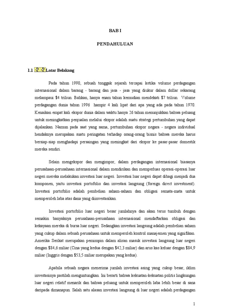Binter Makalah Perbedaan dalam Budaya (Internasional ... INTERNASIONAL DAN INVESTASI LANGSUNG LUAR NEGERI (FDI) MAKALAH BISNIS INTERNASIONAL. Dosen Pengampu : Viajeng Purnama Putri, S., M. Disusun Oleh : Aditya Setiawan 201810160311268; Julyananda Falleria NB 201810160311357; Alfiani Gusti Novita KS 201810160311369; Ika Novita Sari 201810160311380; Ayu Eka Nabila 201810160311394; PROGRAM STUDI MANAJEMEN Makalah Perekonomian Indonesia Tentang Neraca Pembayaran ... Dengan menyebut nama Allah SWT yang Maha Pengasih lagi Maha Panyayang, Kami panjatkan puja dan puji syukur atas kehadirat-Nya, yang telah melimpahkan rahmat, hidayah, dan inayah-Nya kepada kami, sehingga kami dapat menyelesaikan makalah tentang " Neraca Pembayaran, Arus Modal Masuk, dan Utang Luar Negeri ". Adapun makalah ini diajukan guna memenuhi tugas mata kuliah Perekonomian Indonesia. Memahami Investasi Langsung Luar Negeri Di Indonesia adalah wewenang Badan Koordinasi Penanaman Modal (BKPM) untuk memberikan persetujuan dan ijin atas investasi langsung luar negeri. Dalam dekade terakhir ini pemodal asing enggan menanamkan modalnya di Indonesia karena tidak stabilnya kondisi ekonomi dan politik. Kini muncul tanda-tanda bahwa situasi ini berubah: ada sekitar 70% ...