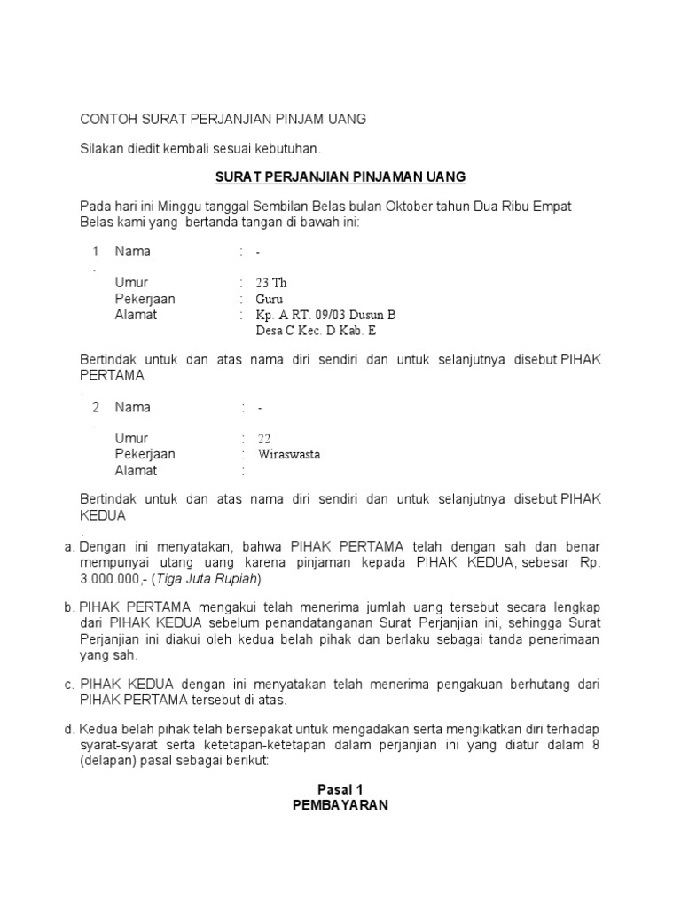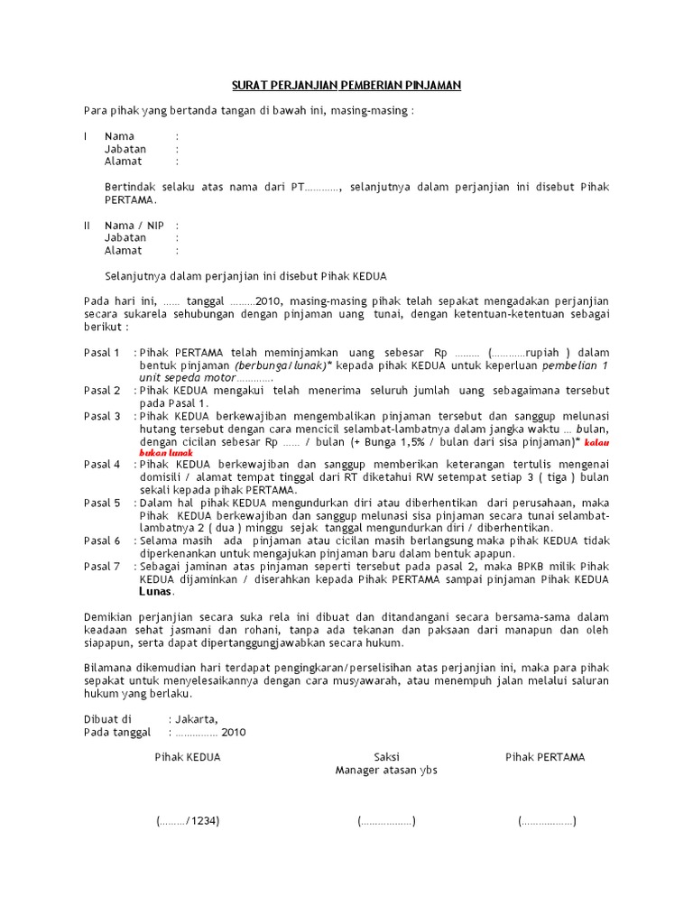 Surat Perjanjian Pinjaman Uang: Pengertian dan Contoh Feb 05, 2021 · Pengertian Surat Perjanjian Pinjaman Uang Secara sederhana, surat perjanjian pinjaman uang dapat dikatakan sebagai acuan tertulis resmi yang melibatkan pemberi dan penerima pinjaman sehingga tidak terjadi hal-hal yang dapat merugikan kedua belah pihak. Alasan Dibuatnya Surat Perjanjian Pinjaman Uang