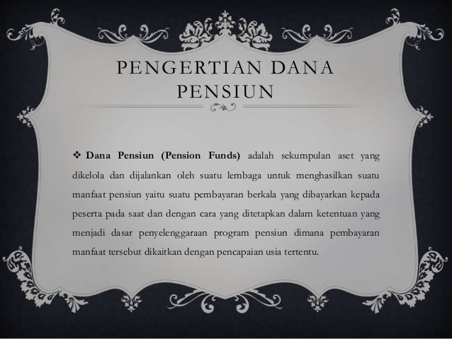 Dana Pensiun | Pengertian dan Skema Perhitungan Apr 01, 2021 · 01: Pengertian Dana Pensiun dan Jenisnya. Apa yang dimaksud dana pensiun? Definisi Dana Pensiun adalah tunjangan tambahan atas gaji atau upah yang diberikan perusahaan untuk karyawannya. Contoh dana pensiun Garuda, Antam, Smart, Samudera Indonesia, RNI, Jasa Marga, Triputra, Perhutani, OJK, Jasa Raharja, Pegadaian.