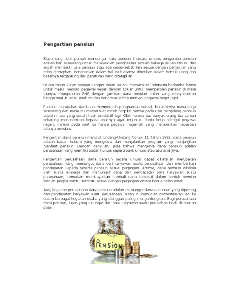 Dana Pensiun - Sarjana Ekonomi UU Dana Pensiun dikenal juga adanya semacam "program pensiun dini" dengan hak memperoleh manfaat pensiun yang dipercepat, manfaat pensiun ditunda atau manfaat pensiun cacat sesuai dengan konteksnya. Demikianlah penjelasan terlengkap mengenai √ Dana Pensiun : Pengertian, Fungsi, Tujuan, Manfaat, Jenis & Sistem Pembayarannya Lengkap. Pengertian Dana Pensiun - PAKDOSEN.CO.ID Dana pensiun berdasarkan UU No. 11 tahun 1992. Perusahaan yang dapat mengelola dan melaksanakan program yang menjanjikan manfaat pensiun. Pensiun adalah keadaan di mana Anda berhenti dari pekerjaan setelah pensiun. Dana pensiun ini adalah hak seseorang yang telah bekerja selama bertahun-tahun sebelum mencapai pensiun atau karena alasan lain. Penghasilan ini biasanya berupa uang yang bisa Anda terima setiap bulan. Ini juga tergantung pada kebijakan yang ada di perusahaan. Dana pensiun adalah jenis perusahaan yang mengelola program pensiun yang bertujuan memberikan manfaat kepada karyawan perusahaan, terutama mereka yang telah pensiun. Pensiun - Pengertian, Jenis dan Contohnya | Tokopedia Kamus Apa Itu Pensiun? Pensiun adalah masa dimana seseorang berhenti bekerja karena memasuki usia atau kondisi tertentu, sehingga harus diberhentikan atau atas permintaan sendiri. Seseorang yang sedang dalam masa pensiun tidak akan memperoleh pemasukan bulanan, namun berhak atas dana pensiun dari perusahaan tempat terakhir bekerja. Jenis-jenis Pensiun