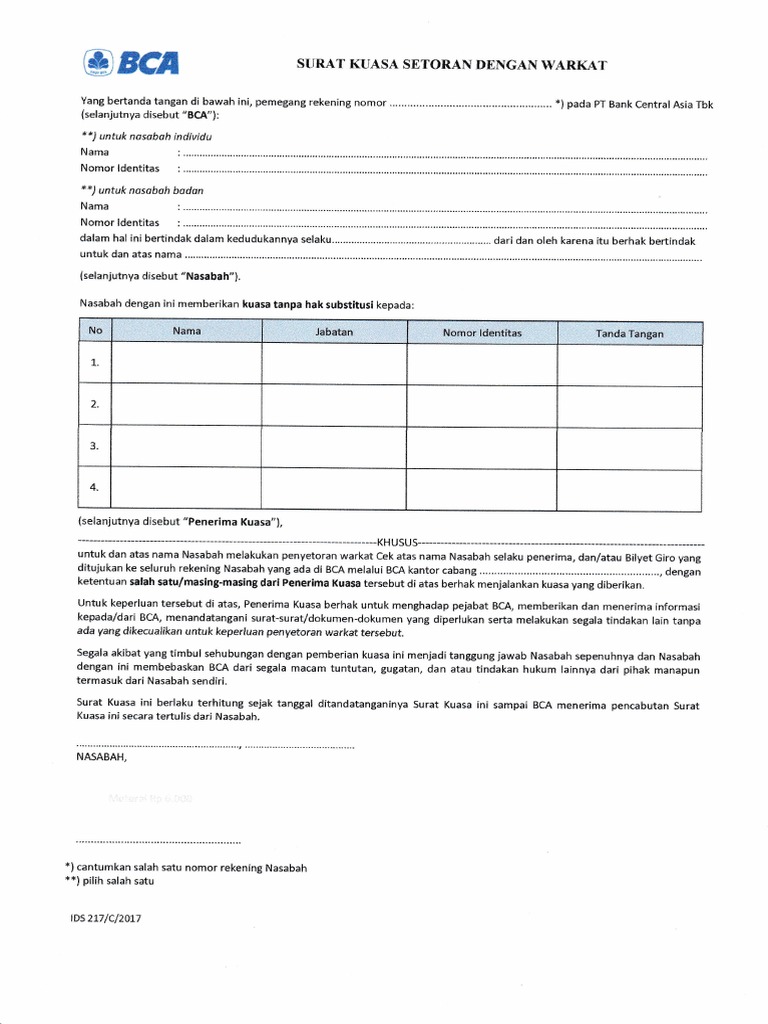 Contoh Surat Kuasa Pencairan Giro Bank Bca - Contoh Surat ... Itulah Contoh Surat Kuasa Pencairan Giro Bank Bca, kami berharap contoh surat yang kami sampaikan dapat membawa manfaat untuk Anda, dan bila dirasa Anda masih kurang puas dengan contoh surat dari kami, maka kami memohon maaf sebesar-besarnya, karena kami menyadari bahwa blog ini masih jauh dari kata sempurna, untuk itu kami mohon masukan dan saran dari Anda demi kemajuan blog ini. Contoh Surat Kuasa Bank BCA Archives - Contohsurat Contoh Surat Kuasa Bank BCA untuk Penarikan Uang Tunai dapat kamu unduh secara lengkap dan gratis pada link di bawah… contoh surat kuasa, Contoh Surat Kuasa Bank BCA, Contoh Surat Kuasa Bank BCA untuk Penarikan Uang Tunai, Download Contoh Surat Kuasa Bank BCA, Download Contoh Surat Kuasa Bank BCA untuk Penarikan Uang Tunai Contoh Surat Kuasa Ke Bank Bca - Download Kumpulan Gambar Contoh Surat Kuasa Ke Bank Bca - Bisa saja terjadi beberapa hal yang membutuhkan jenis surat ini misalnya mengurus kartu atm. Contoh surat keterangan kerja. Surat kuasa cetak rekening koran jadi kan ceritanya di bulan juli besok saya dan dua anak saya plus ibu dan dua adek walah banyak mau main ke australia buat nengokin adek saya yang laen banyak yah adeknya sekaligus jalan jalan. surat kuasa pendebetan rekening - BCA Finance SURAT KUASA PENDEBETAN REKENING. Diisi oleh BCA Finance. Cabang BCA Finance: Nomor Kontrak: No. Pin: Yang bertandatangan dibawah ini:.