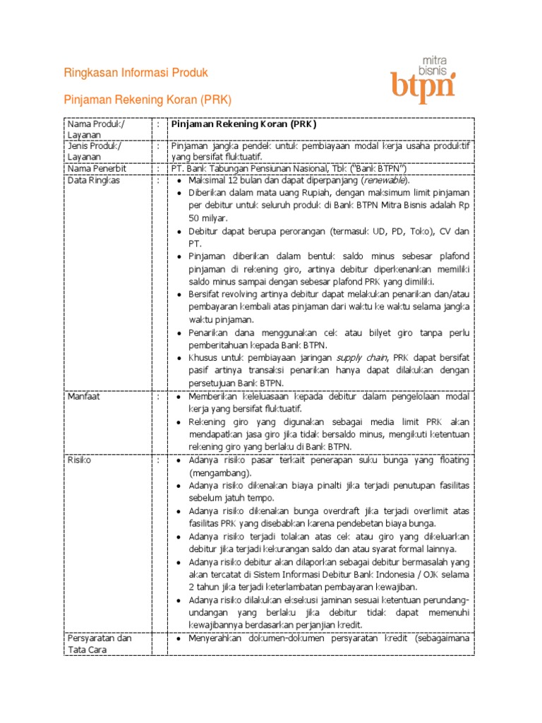 Ringkasan Informasi Produk. Pinjaman Rekening Koran (PRK) Nama... Bunga pinjaman dihitung secara harian dari saldo debet rekening giro debitur dan dibebankan secara otomatis oleh sistem setiap tanggal 25. 11 Ringkasan Informasi Produk Giro Bisnis Nama : Giro Bisnis Produk/Layanan Jenis : Simpanan berupa rekening giro produk/layanan Nama penerbit : PT.