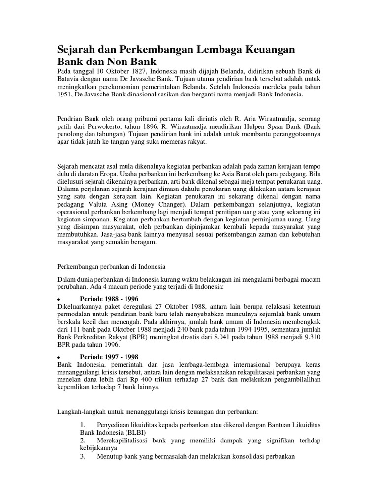 (PDF) Perkembangan Perbankan di Indonesia | Jericho ... Perkembangan Perbankan di Indonesia Kondisi dunia perbankan di Indonesia telah mengalami banyak perubahan dari waktu ke waktu. Perubahan ini selain di sebabkan oleh perkembangan internal dunia perbankan, juga tidak lepas dari pengaruh perkembangan di luar dunia perbankan, seperti sektor ril dalam perekonomian, politik, hokum, dan social.