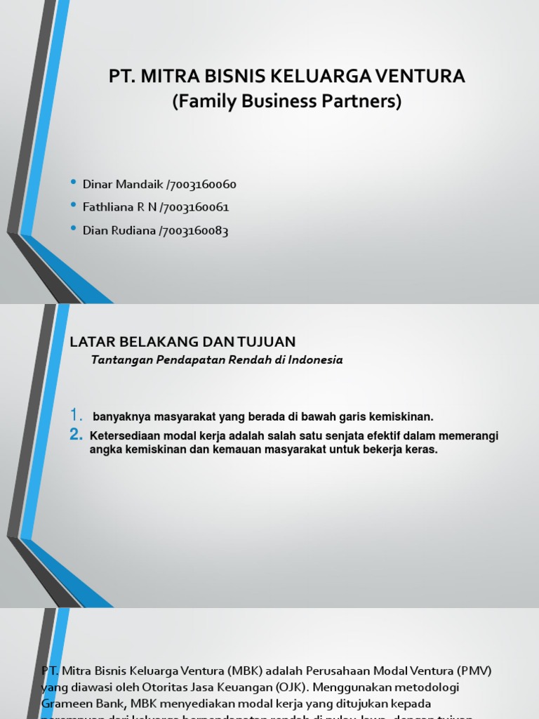 PT Mitra Bisnis Keluarga Ventura | Jobplanet "Mitra Bisnis Keluarga" (MBK), or "Family Business Partners", is a microfinance institution (MFI) regulated by the Indonesian Financial Services Authority (FSA), and licensed as a non-bank finance company. Using the Grameen Bank methodology, MBK provides working capital to...