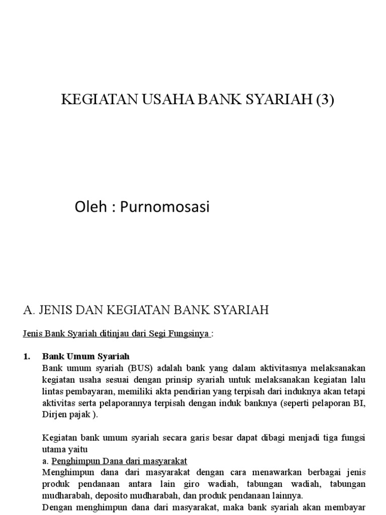 Pengertian Bank Syariah: Kegiatan Usaha, Prinsip Kerja ... Bank Umum Syariah (BUS) adalah Bank Syariah yang dalam kegiatannya memberikan jasa dalam lalu lintas pembayaran. Kegiatan usaha yang dapat dilaksanakan oleh Bank Syariah adalah: menghimpun dana dalam bentuk Simpanan berupa Giro, Tabungan, atau bentuk lainnya yang dipersamakan dengan itu berdasarkan akad wadi'ah atau akad lain yang tidak ...