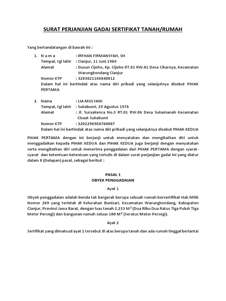 41 gadai surat tanah di pegadaian - Info Perbankan Hari Ini Soal tenor, gadai sertifikat tanah di Pegadaian menawarkan opsi antara 3 sampai 5 tahun lamanya. Syaratnya pun serupa dengan pengajuan di bank, yakni harus berusia minimal 21 tahun saat melakukan pengajuan dan maksimal 64 tahun saat kredit berakhir. Contoh Surat Gadai Tanah Dan Sawah Lengkap, Baik dan Benar ... Mau Gadai Sertifikat Tanah di Pegadaian? Simak Prosedur ... JAKARTA, KOMPAS.com - Gadai surat tanah di Pegadaian bisa menjadi solusi saat membutuhkan dana mendesak dalam waktu cepat dan jumlah besar. Selain aman terdaftar dan diawasi oleh Otoritas Jasa Keuangan (OJK), proses pengajuan gadai surat tanah di Pegadaian juga terbilang mudah.. Meski begitu, nasabah perlu mengetahui apa saja syarat gadai surat tanah di Pegadaian atau syarat gadai sertifikat ... Tabel Angsuran Pinjaman Bank BRI Jaminan Sertifikat Rumah Syarat gadai sertifikat rumah di Bank BRI, antara lain: Identitas asli berupa e-KTP / SIM. Fotokopi bukti nikah suami/ istri (bagi yang sudah menikah), Kartu Keluarga (KK). Surat Keterangan Usaha, minimal dari desa, kelurahan, ataupun pasar. Sertifikat rumah asli dan salinan sebagai agunan atau jaminan Gadai Sertifikat Rumah di Bank BRI dengan Mudah, Pilihan ... Syarat Diterima Gadai Sertifikat di Bank BRI Untuk kemudahan usaha, secara umum kamu bisa mengajukannya langsung ke kantor cabang BRI terdekat. Proses administrasi, screening untuk memperoleh pinjaman bisa kamu lakukan dalam tempo tiga sampai tujuh hari kerja dengan pencairan selama 30 menit.