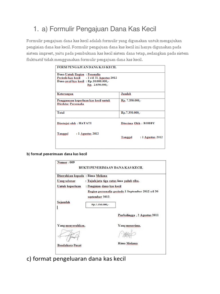 (PDF) Dokumen Pengajuan Uang Tunai/Kas Kecil | M Reyhan ... 3. Jelaskan tentang langkah-langkah pengawasan intern perusahaan terhadap kas dalam hal pengeluaran uang ! 4. Jelaskan tentang prosedur pengelolaan Kas Kecil ! 5. Buatlah Form/Format Bukti Pengeluaran Kas Kecil ! 6. Buatlah Form/Format Bukti Penerimaan Kas Kecil ! 7. Buatlah Form Pengajuan Dana Kas Kecil ! 8. Buatlah Jurnal Kas Kecil ! 9. Dokumen Pengajuan Uang Tunai - PDF Free Download Macam-macam Dokumen Pengajuan Uang Tunai Dokumen pengajuan uang tunai biasa dalam bentuk formulir pengajuan dana kas. Pengajuan uang tunai biasanya digunakan dalam Kas Kecil (Petty Cash) memiliki form sebagai berikut : 1. Formulir pengajuan uang tunai 2. Formulir penerimaan uang tunai 3. Format Pengajuan Dana Kas Kecil | PDF - Scribd Format Pengajuan Dana kas kecil 1. Permintaan Pengeluaran Kas Kecil Dokumen ini digunakan oleh pemakai kas kecil untuk meminta uang kepada pemegang kas kecil ketika akan melalukan pengeluaran kas kecil. Bagi pemegang kas kecil dokumen ini merupakan bukti pengeluaran. Dokumen ini diarsipkan oleh pemegang kas kecil