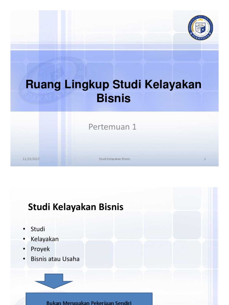 PPT – Studi Kelayakan Bisnis PowerPoint presentation | free ... STUDI KELAYAKAN BISNIS - STUDI KELAYAKAN BISNIS Minggu VI ASPEK RESIKO BISNIS EKONOMI, SOS-POL, LINGKUNGAN, ... The PowerPoint PPT presentation: "Studi Kelayakan Bisnis" is the property of its rightful owner. Do you have PowerPoint slides to share? If so, share your PPT presentation slides online with PowerShow.com. ... SKB PPT | PENILAIAN BISNIS dan studi kelayakan bisnis media belajar di bidang bisnis dan studi kelayakan bisnis atau penilaian bisnis bagi mahasiswa, dosen dan para pakar bisnis serta pelaku bisnis 1. Ruang Lingkup Studi Kelayakan Bisnis.ppt - Ruang ... konflik & kinerja perusahaan 5804/20/20 studi kelayakan bisnissituasi tingkat konflik antar kelompok sifat konflik karakteristik organisasi kinerja i rendah atautidak ada konflik disfungsional adaptasi lambat terhadapperubahan lingkungan rendahsedikit perubahan apatis stagnasi ii optimal fungsional gerakan positif ke arahpencapaian tujuan … Materi Lengkap Studi Kelayakan Bisnis MATERI SLIDE KULIAH STUDI KELAYAKAN BISNIS. Bagi mahasiswa yang mengambil mata kuliah STUDI KELAYAKAN BISNIS, wajib mengunduh materi berikut ini untuk dipelajari sebelum mengikuti kuliah dengan Dr. Ahmad Subagyo: Pertemuan-1_ Pengantar Studi Kelayakan. Pertemuan-2_Pengertian Studi Kelayakan.