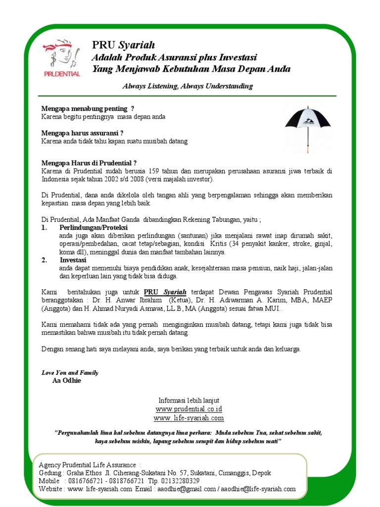 Asuransi Pendidikan Syariah Bagi Masa Depan Anak Feb 01, 2016 · Selain prudential, banyak asuransi syariah lainnya yang memberikan Anda pelayanan dan keuntungan berbasis syariah salah satunya asuransi pendidikan syariah Mandiri. Agar anak Anda mendapatkankan pendidikan yang terbaik, asuransi syariah mandiri memiliki progaram khusus untuk asuransi pendidikan yaitu BSM Investa Cendekia. Asuransi Syariah Prudential Asuransi Syariah Prudential,TERBAIK 085290747888 Asuransi Syariah Prudential Konsep Dasar Asuransi Syariah Asuransi Tidak Islami? Sebagian kalangan Islam beranggapan bahwa asuransi sama dengan menentang qodlo dan qadar atau bertentangan dengan takdir. Pada dasarnya Islam mengakui bahwa kecelakaan, kemalangan dan kematian merupakan takdir Allah. Prudential Syariah Diluncurkan, Siap Perluas Pasar ... Presiden Direktur Prudential Prudential Syariah Diluncurkan, Siap Perluas Pasar Asuransi Syariah - Chanelmuslim.com PT Prudential Sharia Life Assurance (Prudential Syariah) resmi diluncurkan pada Selasa, (05/04/2022) di The Westin Jakarta.
