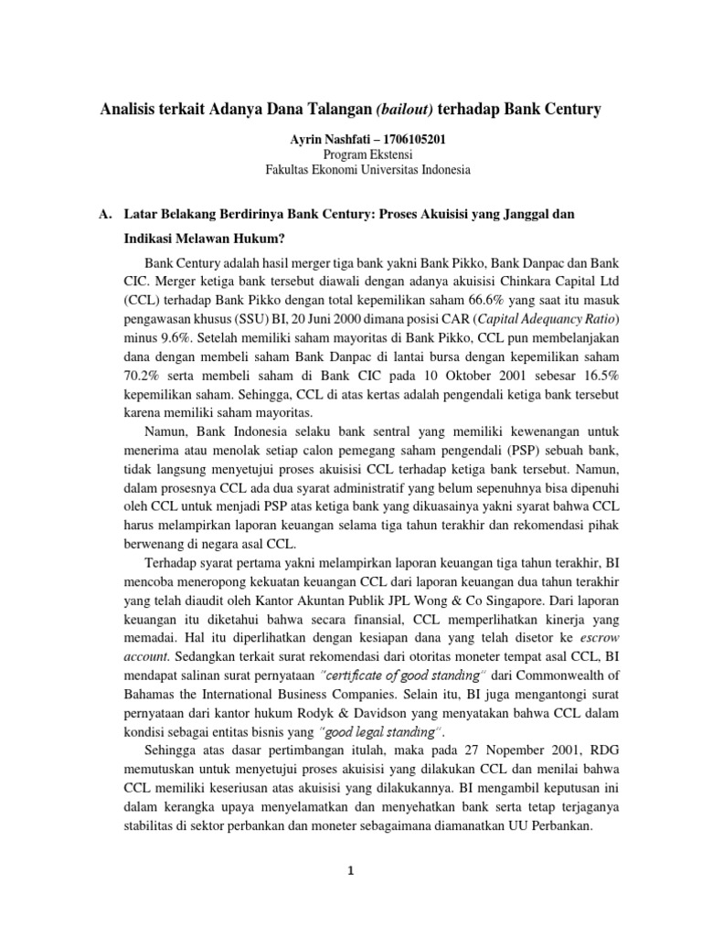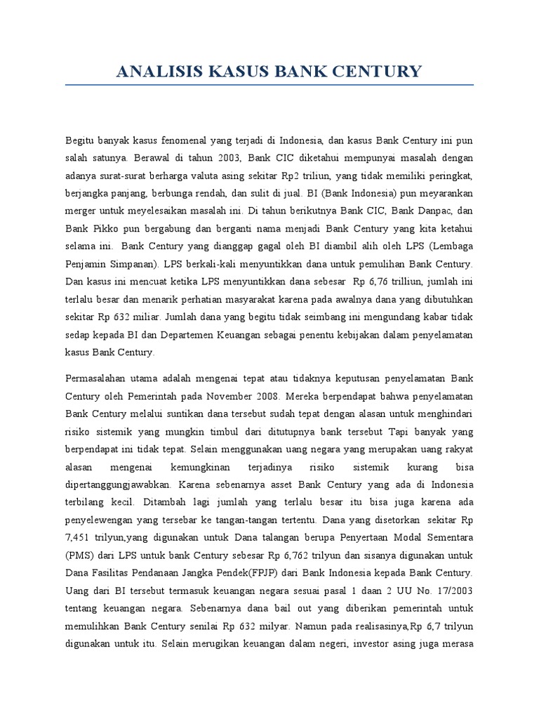 Analisis kasus bank century. The Century Bank Case - A Never Ending Story | ICW The handling of the Century Bank bailout case should continue to get public attention because it concerns public trust and justice. It is ironic that on the one hand the public has to fight hard to obtain basic rights, but on the other hand a few people can easily be bailed out using state money to cover up their deviant behavior. analisis bank century | Muhammadumam's Blog BAB I PENDAHULUAN 1.1 Latar Belakang Seperti yang kita ketahui berita yang sedang hangat sering disajikan oleh media massa dan menjadi kasus sorotan masyarakat adalah mengenai kasus salah satu badan usaha nirlaba yaitu Bank Century. Bank Century sebagai salah satu lembaga sebagai bank masyarakat terjerat dalam kasus yang sampai saat ini belum berkesudahan dan menjadi… Tugas 2 : Manajemen Risiko pada Bank Century (Kasus Riil ... Kasus Bank Century yang kini berubah nama menjadi Bank Mutiara terus bergulir kencang padahal awalnya tampak biasa saja. Namun, kini kasus itu menggelinding memasuki ranah politik segera setelah Dewan Perwakilan Rakyat (DPR) membentuk Panitia Khusus (Pansus) Hak Angket Bank Century. PELANGGARAN ETIKA PROFESI KASUS BANK CENTURY - tritriwulansari kasus korupsi bank century ternyata membawa dampak terhadap berbagai sektor, khususnya stabilitas politik dan perekonomian di indonesia, terlebih setelah hasil audit bpk menyatakan bahwa telah terjadi penyalahgunaan wewenang dan pelanggaran pidana dalam kasus ini, diantaranya unsur kerugian negara, pelanggaran undang-undang, dan ditemukannya …