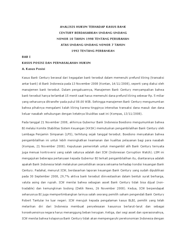 Analisis Kasus Bank Century - M | PDF Scribd adalah situs bacaan dan penerbitan sosial terbesar di dunia. Mix: Kasus L/C Bank Century (Analisis) - Blogger Analisis mengenai penjual dan pembeli dalam kasus Bank Century disini adalah penjual adalah Robert Tantular (pemegang saham mayoritas di Bank Century yang menjual reksa dana fiktif kepada beberapa bank dan sejumlah perusahaan. Pihak eksporitr atau yang lebih tepat dikatakan sebagai pihak-pihak yang menerima dana dari bank century seperti PT. Kronologi Lengkap Kasus Uang Rp 22 Miliar Winda Earl dan ... Maybank Indonesia) JAKARTA, KOMPAS.com - Atlet e-Sport Winda D Lunardi alias Winda Earl dan ibunya, Floletta Lizzy Wiguna yang kehilangan uang Rp 22 miliar viral belakangan ini. Uang itu hilang di salah satu bank, yakni Maybank Indonesia. Kasus raibnya uang akhirnya diselesaikan di ranah hukum. Analisis Kasus Bank Century | Muhammad Arief Fauzi Kasus Bank Century memiliki dampak yang sangat besar terhadap bank-bank lainnya dan mempengaruhi tingkat kepercayaan masyarakat terhadap sistem perbankan nasional. Kasus yang dialami Bank Century tidak hanya berdampak pada perbankan Indonesia, tetapi juga berdampak pada perbankan dunia. BAB II LANDASAN TEORI