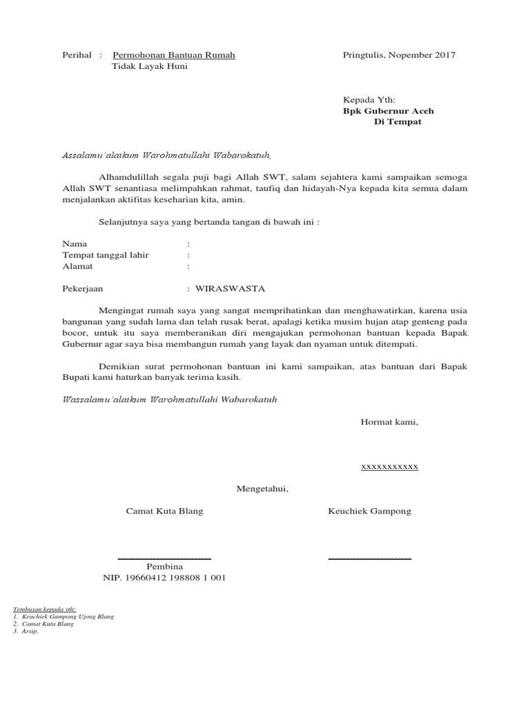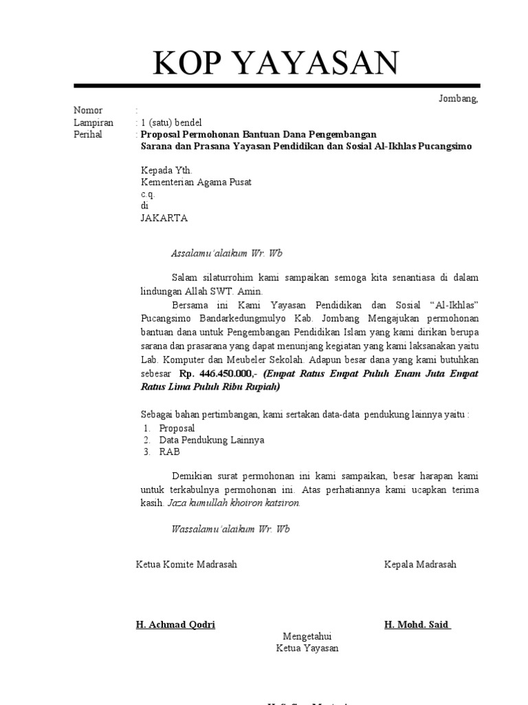 Proposal Permohonan Dana Rehab Bangunan MDTA Lengkap ... Supaya dana yang digunakan untuk rehab tidak sepenuhnya dari pemilik MDTA, maka sebaiknya pemilik menyusun proposal permohonan dana rehab bangunan. Menyikapi hal tersebut, pada hari ini akan dibagikan sebuah file berupa document yang di dalamnya berisi Proposal Permohonan Dana Rehab Bangunan MDTA . Proposal Permohonan Bantuan Dana ... - Berkas Sekolah Bapak dan Ibu tinggal merubah saja data sekolah didalamnya serta merubah jumlah anggaran yang dibutuhkan untuk Rehab Ringan, Sedang dan Berat. Karena ke 3 itu ada perbedaan jumlah penerimaan nantinya. Untuk Rehab Ringan biasanya mendapatkan Dana sebesar 75 Juta, Sedang 90 juta dan Berat 114 Juta. Contoh Penulisan Proposal Permohonan Rehab Ruang Belajar ... CONTOH PENULISAN PROPOSAL PERMOHONAN REHAB RUANG BELAJAR PONDOK PESANTREN ... kami dari fihak pengelola mengajukan bantuan dana kepada pemerintah, mengingat sumber dana yang ada dipondok tidak mencukupi untuk Merehab Ruang Kelas ( MRK ) yang diperkirakan berjumlah 4 kelas dan asrama santri dengan ukuran yang sama,sehingga total biaya ... Contoh Proposal Pembangunan Musholla - Sominhom Lop Dana yang sudah ada pada panitia adalah Rp 1000000- Satu Juta Rupiah dan batu bata sebanyak 1000 biji senilai Rp. 01 PAN-MBNI-08 Kuren 02 Maret 2008. Contoh Proposal Pembangunan Musholla Al Mustakim Berikut ini merupakan proposal yang dapat anda jadikan referensi untuk membuat permohonan bantuan dana untuk pembangunan mushola.