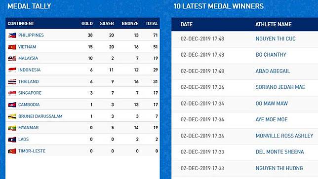 Timnas Atletik Uji Coba ke Singapura untuk SEA Games Hanoi Pada SEA Games edisi sebelumnya di Filipina pada 2019, Indonesia finis urutan kelima dalam perolehan medali cabang olahraga atletik dengan lima emas, enam perak, dan lima perunggu. Vietnam menjadi negara dengan medali terbanyak yakni 16 emas, 12 perak, 10 perunggu. Sementara Thailand di bawahnya dengan 12 emas, 11 perak, 12 perunggu. Timnas Taekwondo Matangkan Persiapan di Spanyol Jelang SEA ... Sedangkan tim taekwondo tuan rumah pada SEA Games 2019 meraih medali terbanyak dengan delapan emas, sembilan perak, dan empat perunggu.Thailand di urutan kedua dengan tujuh emas, tiga perak, enam perunggu. Lalu, Vietnam di urutan ketiga dengan lima emas, dua perak, tujuh perunggu. sumber : Antara Jelang SEA Games 2021, Timnas Taekwondo Indonesia Jalani ... PB TI menargetkan Indonesia bisa melebihi pencapaian SEA Games 2019 di Filipina. Kala itu, Merah Putih meraih dua perak dan delapan perunggu. Hasil tersebut menempatkan Indonesia di urutan keenam klasemen akhir perolehan medali cabang olahraga taekwondo SEA Games 2019. Timnas Atletik Uji Coba ke Singapura untuk SEA Games 2022 ... Pada SEA Games edisi sebelumnya di Filipina pada 2019, Indonesia finis urutan kelima dalam perolehan medali cabang olahraga atletik dengan lima emas, enam perak, dan lima perunggu. Vietnam menjadi negara dengan medali terbanyak yakni 16 emas, 12 perak, 10 perunggu. Sementara Thailand di bawahnya dengan 12 emas, 11 perak, 12 perunggu.