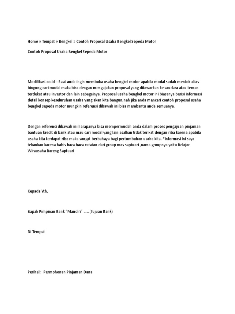 Proposal pengajuan pinjaman uang ke bank. proposal usaha untuk pinjam uang ke bank - Blogger proposal usaha untuk pinjam uang ke bank Proposal Usaha Kontrakan & Koskosan ... INVESTASI PINJAMAN MISSAN CHRISTABEL yang membantu saya dengan pinjaman 300 miliar dan sekarang saya memiliki transfer pinjaman ke rekening bank saya dan saya hanya melakukan pembayaran untuk memindahkan pinjaman saya tanpa menambah rasa sakit saya dan sekarang ... Contoh Proposal Pengajuan Pembiayaan - Beinyu.com PROPOSAL PENGAJUAN PINJAMAN MODAL USAHA KE BANK Yogyakarta 4 Februari 2013 Kepada Yth. BanKeu ini biasanya terutama di jawa tengah memiliki besaran lima juta rupiah 5000000. Ini saya berikan contoh Proposal Pengajuan Pembiayaan milik usaha saya sendiri. 4 Langkah Menyusun Proposal Bisnis Sebelum Meminjam Uang ... Ini adalah informasi penting yang dibutuhkan bank untuk menganalisis pinjaman kamu. Jadi, pastikan angkanya realistis dan nggak muluk-muluk. 4. Perhatikan beberapa kiat menyusun proposal bisnis. Agar proposal bisnismu meyakinkan dan enak dibaca, perhatikan kiat-kiat berikut ini: Gunakan bahasa yang sederhana. Pinjaman Bank untuk Usaha: Cara Mengajukan dan ... - KoinWorks Tunjukan kesungguhan kamu dalam membuka usaha tersebut agar pihak bank mau memberikan persetujuan pengajuan pinjaman kamu. Bila perlu, siapkan proposal dalam bentuk hard copy. ... Demikianlah cara mengajukan pinjaman uang ke bank untuk mendapatkan modal usaha. Jika pengajuan pinjaman kamu telah disetujui oleh pihak bank maka kamu pun bisa ...