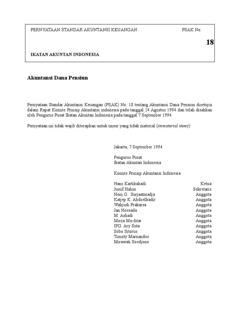 Lembaga Keuangan Non Bank Jenis, Prinsip, Kegiatan Usaha ... Dana Pensiun Berdasarkan UU No 11 Tahun 1992 tentang Dana Pensiun ... konsep dasar dan prinsip akutansi: Akutansi dana pensiun Akuntansi Dana Pensiun. Dana Pensiun merupakan suatu badan hukum yang berdiri sendiri dan terpisah dari Pemberi Kerja, yang berfungsi untuk mengelola dan menjalankan program pensiun sesuai dengan peraturan perundangan yang berlaku. Mengingat bahwa Dana Pensiun mempunyai tujuan dan kegiatan usaha yang berlainan dengan perusahaan pada umumnya ... Jelaskan prinsip kegiatan usaha dana pensiun! Prinsip kegiatan usaha dana pensiun, ada pun tujuh prinsipnya adalah sebagai berikut. Prinsip kejelasan maksud dan tujuan program. Ada jaminan terhadap kesinambungan penghasilan; Prinsip independensi. Prinsip Dana Pensiun dari A - Z yang Wajib Diketahui Sebagai program yang bertujuan untuk memberikan manfaat dan jaminan hari tua kepada karyawan dan pekerja setelah memasuki masa pensiun maka dana tersebut harus dikelola dengan cara yang benar. Terdapat 7 prinsip dasar yang digunakan dalam pengelolaan dana pensiun tersebut, yaitu seperti di bawah ini. a. Kejelasan atas maksud serta tujuan program b. Independensi c. Akuntabilitas atau accountability d. Transparansi/ keterbukaan atau transparency e. Perlindungan konsumen f. Struktur pengendalian internal g. Kualifikasi badan penyelenggara
