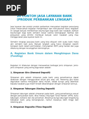 Makalah tentang layanan jasa perbankan syariah: Jasa ... Jasa layanan di Bank Syariah Mandiri: 1. Jasa Produk - BSM Card - Sentra Bayar BSM - BSM SMS Banking - BSM Mobile Banking GPRS - BSM Net Banking - Pembayaran melalui menu Pemindahbukuan di ATM (PPBA) - Jual Beli Valas BSM - Bank Garansi BSM - BSM Electronic Payroll - SKBDN BSM (Surat Kredit Berdokumen Dalam Negeri) - BSM Letter of Credit riniisparwati.com › pekerjaan-yang-menghasilkan-jasa31 Jenis Pekerjaan Yang Menghasilkan Jasa ... - Rini Isparwati Satpam menghasilan jasa layanan berupa penjagaan keamanan di tempat dia menjaga. Mulai dari hotel, sekolah, kantor pemerintah, pabrik, kantor swasta, pasar, bank, dan bidang lainnya, biasanya mengangkat satpam sebagai petugas keamanan. 8. Tukang potong rambut. Manusia tentu sangat susah untuk mencukur rambut sendiri. Bank adalah: Tugas, Fungsi, Tujuan, Usaha dan Jenisnya Menempatkan atau meminjam dana dan atau meminjamkan dana kepada bank lain. Menerima pembayaran dan melakukan perhitungan antar pihak ketiga. Menyediakan tempat untuk menyimpan barang dan surat berharga. Melakukan kegiatan penitipan untuk kepentingan pihak lain. √ 20 Contoh Jasa Layanan Bank (Produk Perbankan Lengkap) Jasa Layanan dan Produk Bank Lainnya 1. Layanan Bank Kiriman Uang (Transfer) 2. Kliring (Clearing) 3. Inkaso (Collection) 4. Safe Deposit Box 5. Bank Card (Kartu kredit) 6. Bank Notes 7. Bank Garansi 8. Bank Draft 9. Letter of Credit (L/C) 10. Cek Wisata (Travellers Cheque) 11. Menerima setoran-setoran 12. Melayani pembayaran-pembayaran 13.