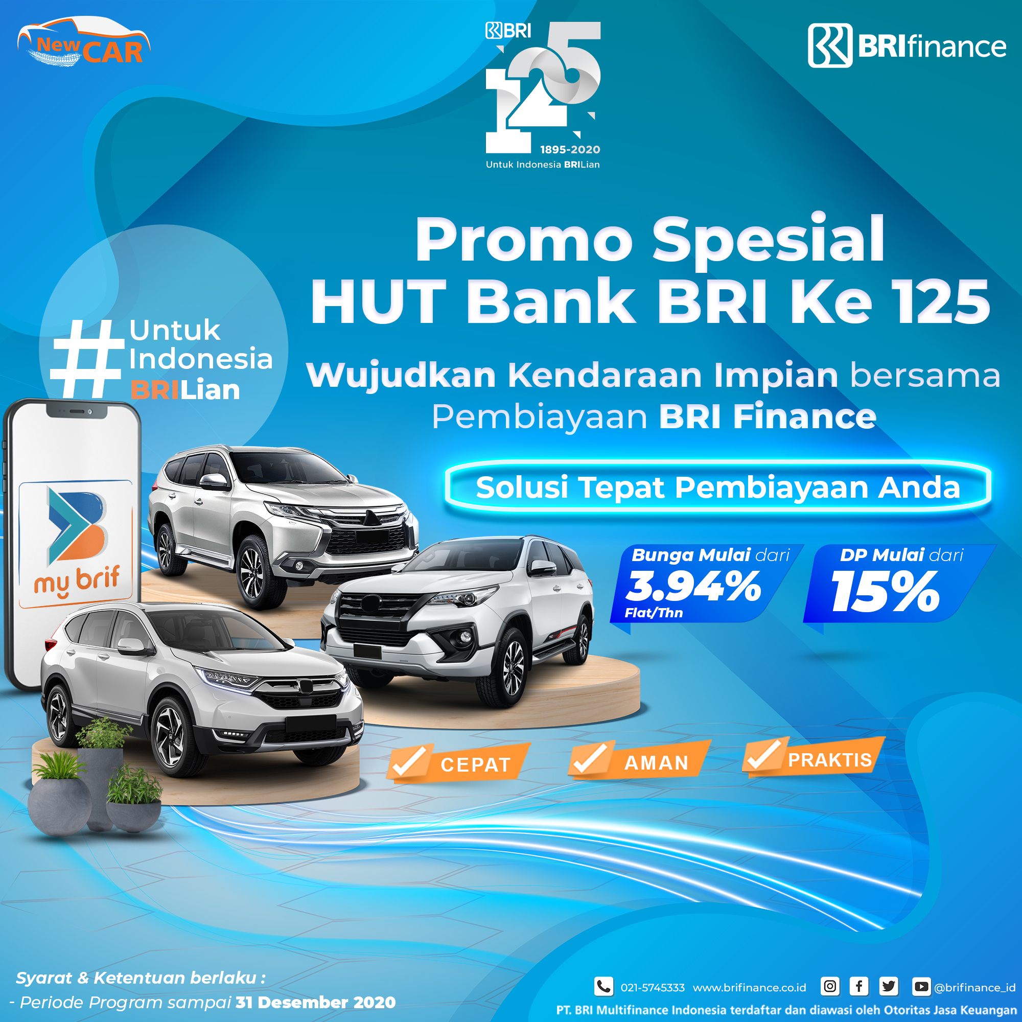 Promo - BRI FINANCE Hai sobat BRIF! Dapatkan fasilitas pembiayaan kendaraan mobil baru dengan Promo Spesial HUT Bank BRI ke 125. Segera hubungi BRI Finance terdekat!
