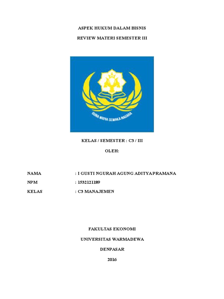 Materi hukum bisnis semester 2. Materi UTS S2 - Pengantar Hukum Bisnis ~ Ekonomi UMS 2013 2. Hukum Bisnis (bisa muncul karena dibuat pemerintah atau lembaga yang berwenang, muncul karena dibuat sendiri) à undang-undang, aturan menteri, aturan bupati à pada saat kita membuat perjanjian dengan orang lain ketika berbinis, maka itu dikatakan sebuah aturan yang mengikat bagi kita dan orang lain dan memiliki sanksi bagi kedua belah pihak. PDF Pengantar Hukum Bisnis - Unpam Pengantar Hukum Bisnis 1 PERTEMUAN I PENGANTAR HUKUM BISNIS A. TUJUAN PEMBELAJARAN. Setelah mempelajari materi pada pertemuan ke-1 Tentang Pengantar Hukum Bisnis, ini usai maka kemampuan yang diharapkan ada pada diri mahasiswa yang mempelajari Pengantar Hukum Bisnis, adalah : 1. Mampu Menjelaskan Pengertian Secara Harfiah, 2. hukum bisnis - IBNU ADIB - Google Search materi kuliah > semester 4 > hukum bisnis. ... hukum bisnis. semester 5. manajement pemasaran. manajement stratejik. pemasaran internasional. perilaku konsumen. semester 6. komunikasi bisnis. Manajement syari'a. Metodologi Penelitian Bisnis. Semester 7. Akuntansi Manajement. PDF Hukum Bisnis - Uny Fungsi Hukum Bisnis: sebagai sumber informasi yang berguna bagi praktisi bisnis untuk memahami hak dan kewajibannya dalam praktik bisnis agar terwujud watak dan perilaku di bidang bisnis yang berkeadilan, wajar, sehat dan dinamis (yang dijamin oleh kepastian hukum) Sumber Hukum Bisnis; 1. Hukum Tertulis : a. KUHPer (BW; Burjelijk Weboek), 2,3,4 b.